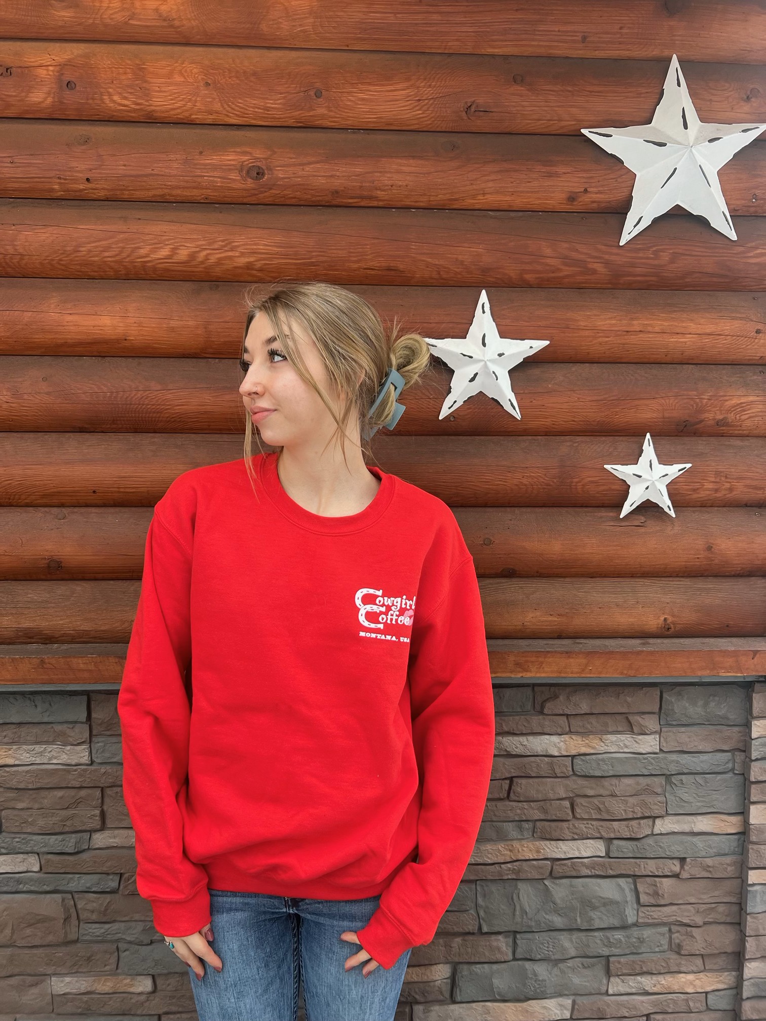 “Make America Cowgirl Again”- RED Cowgirl Coffee cozy Crew Neck